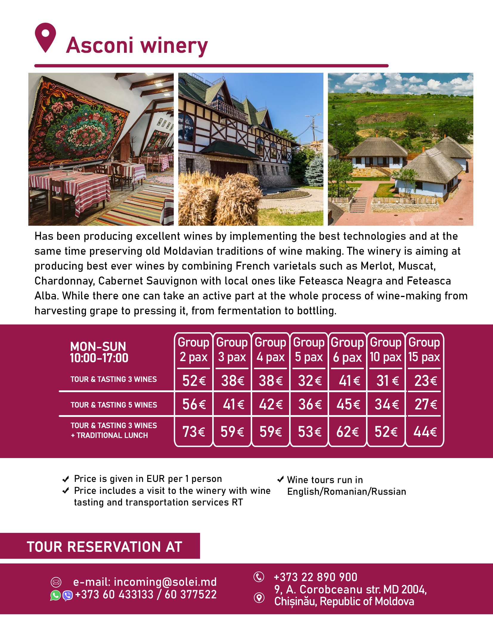 We invite everybody to enjoy our wine tours and wine tastings, follow the wine road in Moldova since the Moldovans have been always considered skillful wine-makers producing God’s blessed drink “wine”.